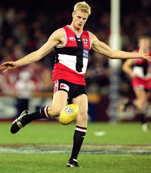 The Rooey 300 guernsey has been designed in conjunction with ISC to replicate the jumper the spectacular forward wore for his debut game in Round 15, 2001 against Adelaide Crows (below).