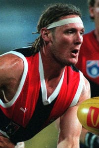 Not as outlandish as Phil Narkle’s headwear but Nathan Burke’s helmet became iconic simply because of the man it was attached to. For the first four years of his career, Burke took to the field bare-headed but a behind the play hit from Gary Ablett sr in the 1991 preliminary final left Burke with a severe head injury and forced him to wear a helmet for more than a decade afterwards. It was during this time that Burke built a reputation as one of the hardest working midfielders in the AFL and quickly developed into a genuine leader of his beloved Saints. Towards the end of his career Burke ditched the helmet but he remains, probably along with Garry Wilson the greatest helmeted player the AFL has ever seen.