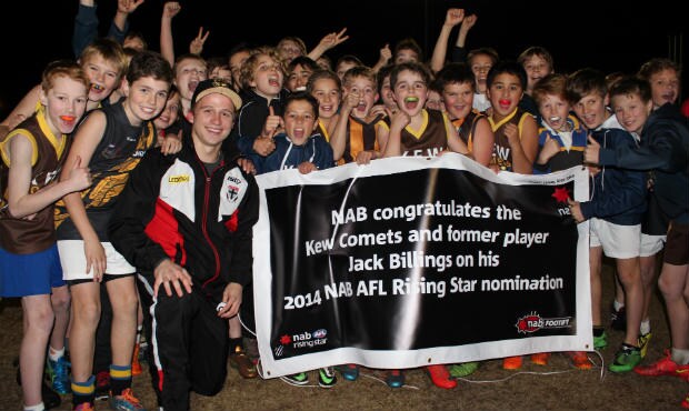 And the boys and girls weren’t just excited to see Billings, with the Kew Comets also receiving $2,500 worth of equipment and apparel courtesy of NAB.“Off the back of Jack’s Rising Star nomination, the club receives ten Sherrins, ten drink bottles [and] a defibrillator… As well as a ball bag,” NAB Regional Executive Peter Rice told SAINTS.com.au.